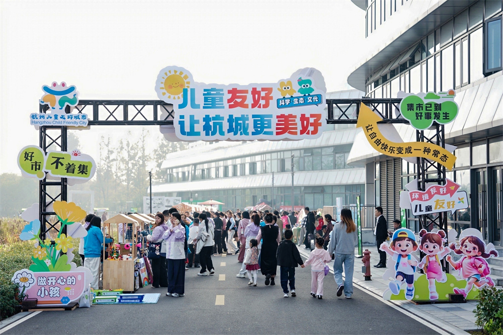 在浙江省杭州市富陽區(qū),家長帶著孩子參加“兒童友好,讓杭城更美好”主題活動。