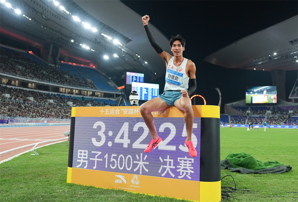 11月20日,廣西隊選手劉德助在比賽后與成績顯示屏合影。他獲得冠軍。當日,第十五屆全國運動會田徑男子1500米決賽在廣州舉行。